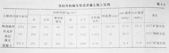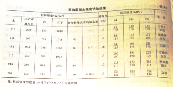 可泵性主要決定于混凝土與管壁之間的摩擦力。由于低標(biāo)號(hào)混凝土的水泥用量少,可泵性差,因此,過(guò)去規(guī)定C15以下的混凝土不得泵送??墒菗饺绶勖夯液蜏p水機(jī)劑后,可使混凝土在不增加水泥的情況下仍能獲得良好的可泵性。在寶電工程中,C2.5、C5和C15的混凝土在300m水平硬管輸送時(shí)也沒(méi)有發(fā)生堵塞現(xiàn)在。表3—3是低標(biāo)號(hào)粉煤灰泵送混凝土的施工實(shí)例。