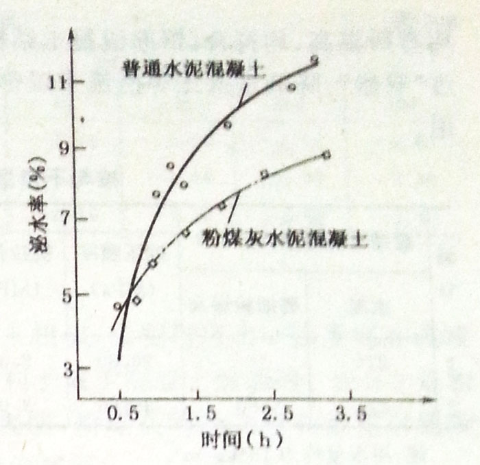 根據(jù)圖3—1所示,粉煤灰混凝土的總泌水率小于普通混凝土,說(shuō)明粉煤灰土不易發(fā)生離析,有利于改善混凝土施工時(shí)的均勻性,提高混凝土的密實(shí)性和耐久性。